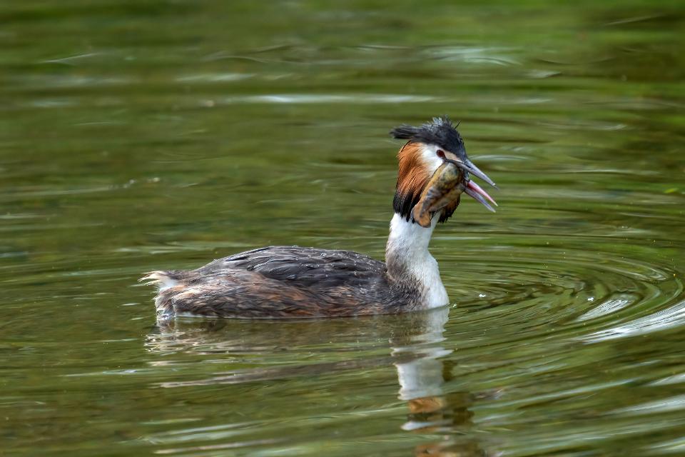 Haubentaucher verschlingt Fisch
