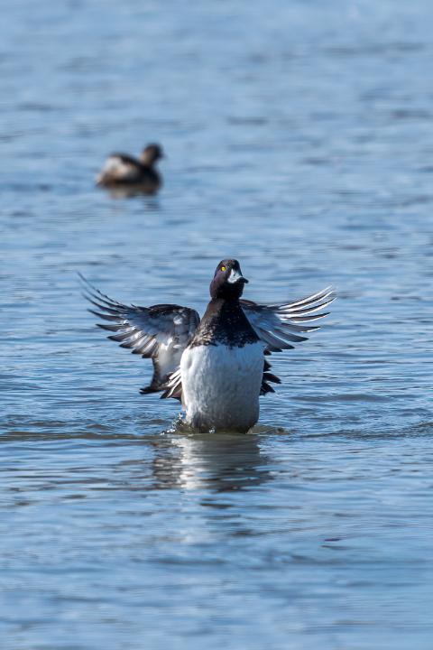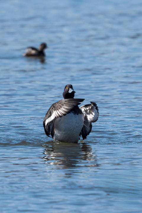 Reiherente Männchen beim Flügelschlag
