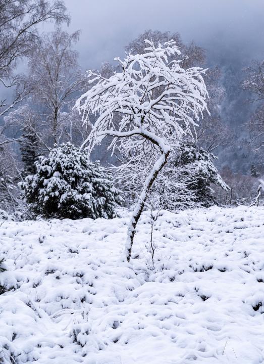 Alleinstehendes verschneites Bäumchen im Kendlmühlfilzn
