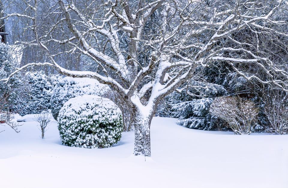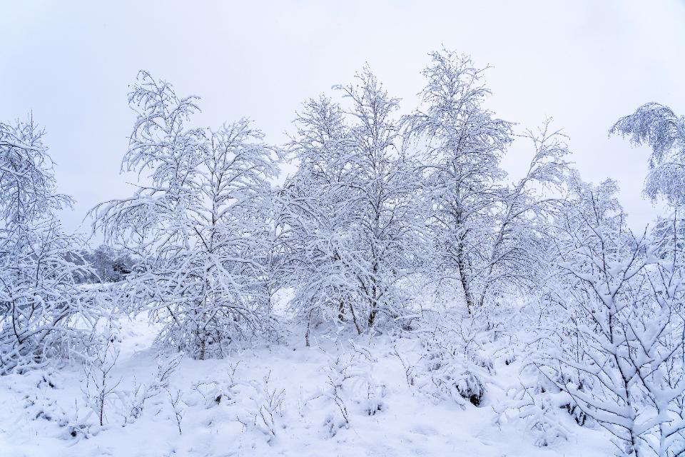 Neue Schneeauflage auf verästeltem Baum und Strauch