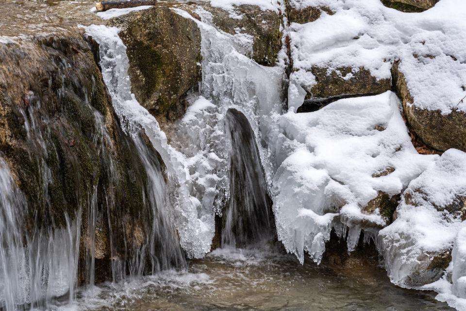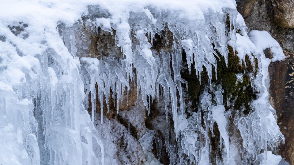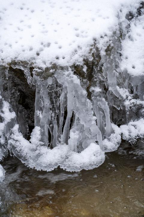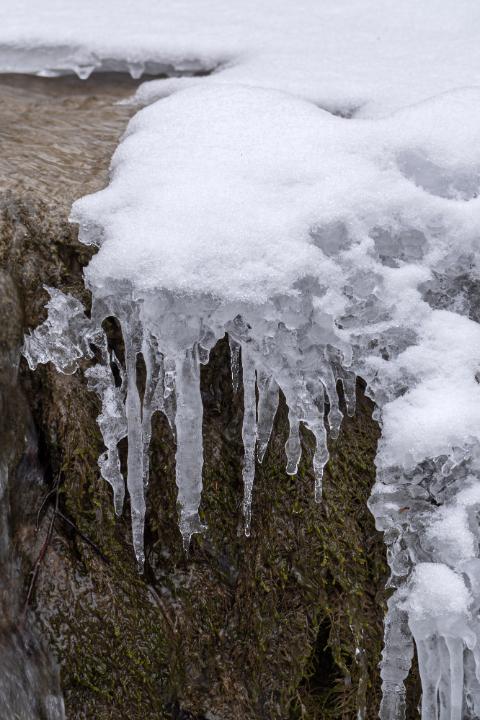 Schneebedeckte Eiszapfengruppe an Felsen im Lochgrabenbach