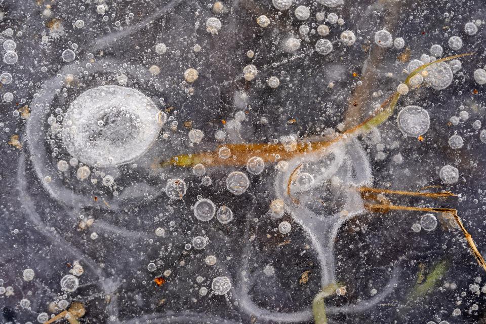 Im Eis eingeschlossene Schilfblätter und Stängel umgeben von runden Lufteinschlüssen