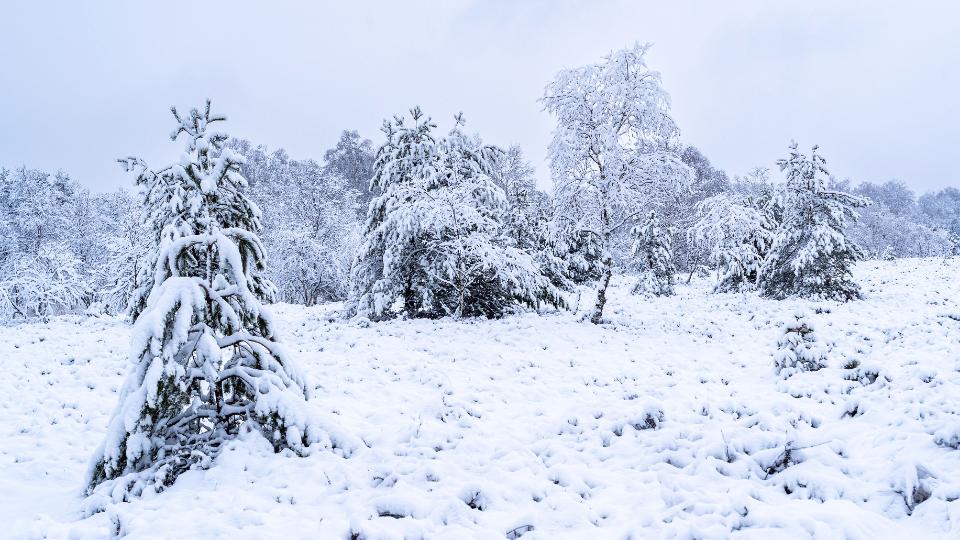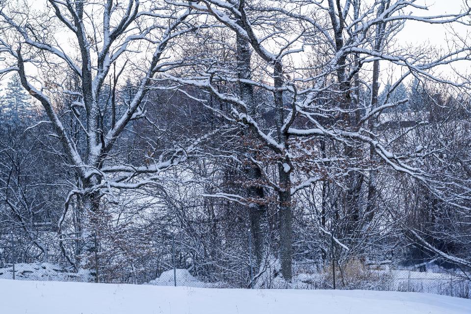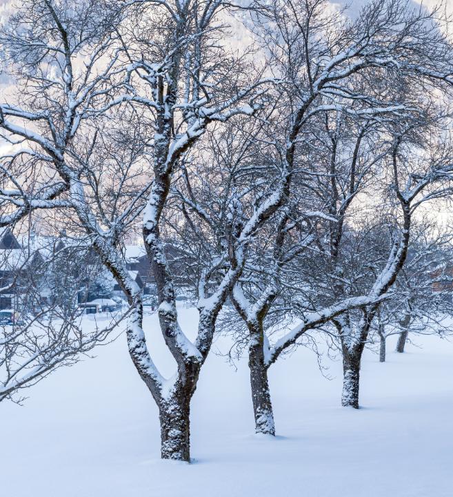 Baumtrio auf Wiese mit neuer Schneeauflage