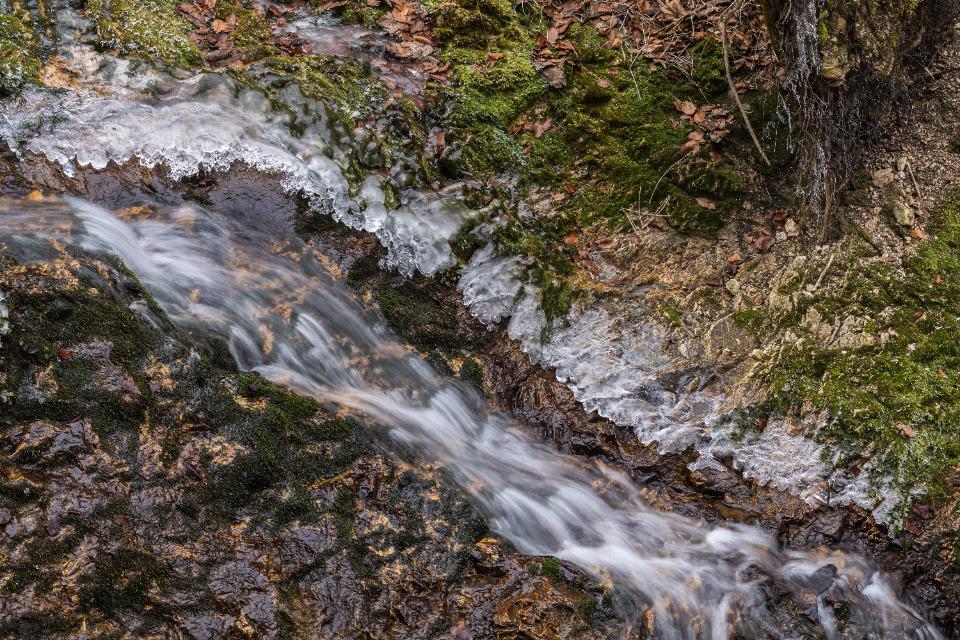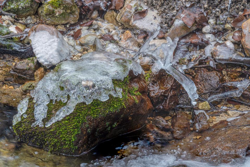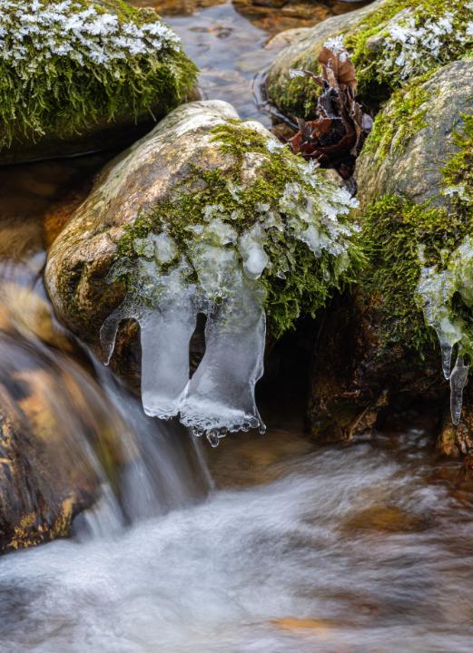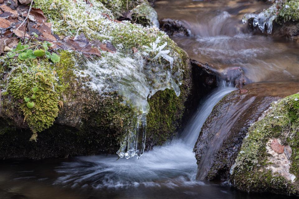 Eisüberzug an bemoostem Felsen im Zellgrabenbach