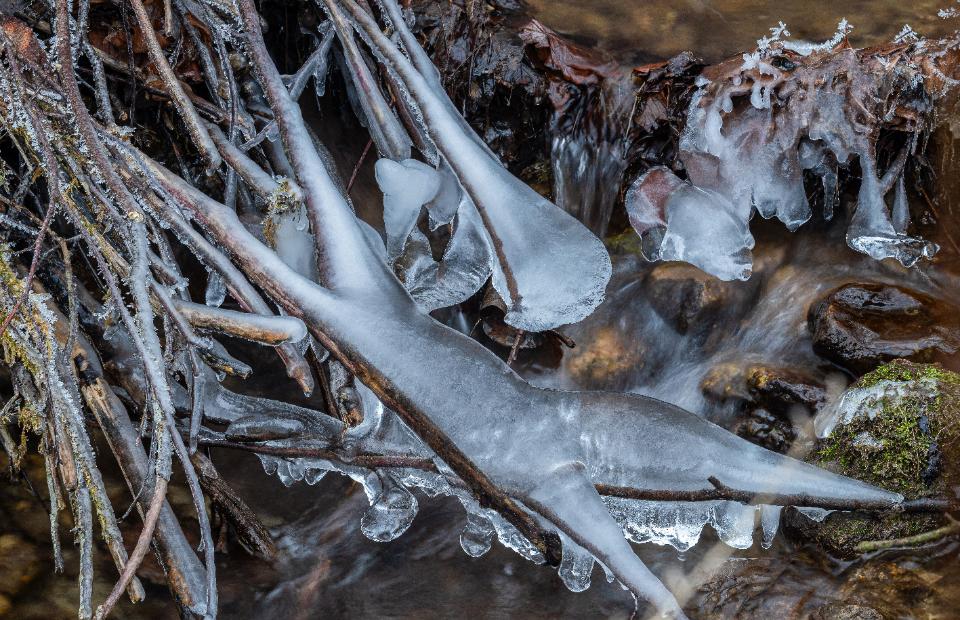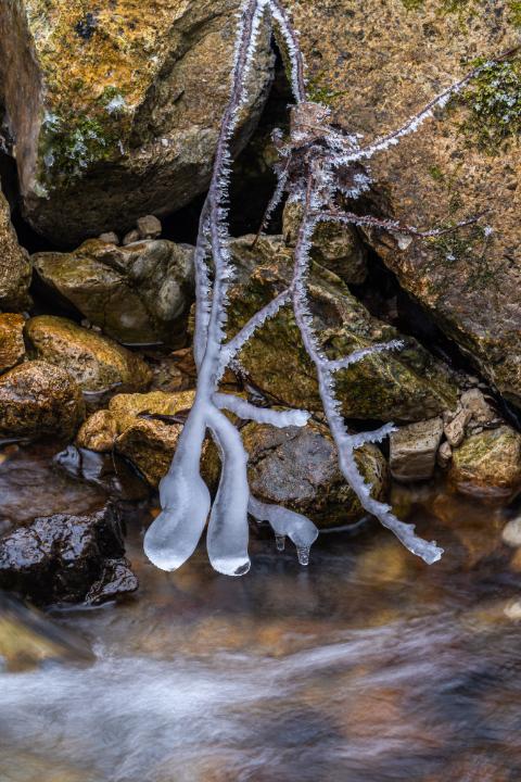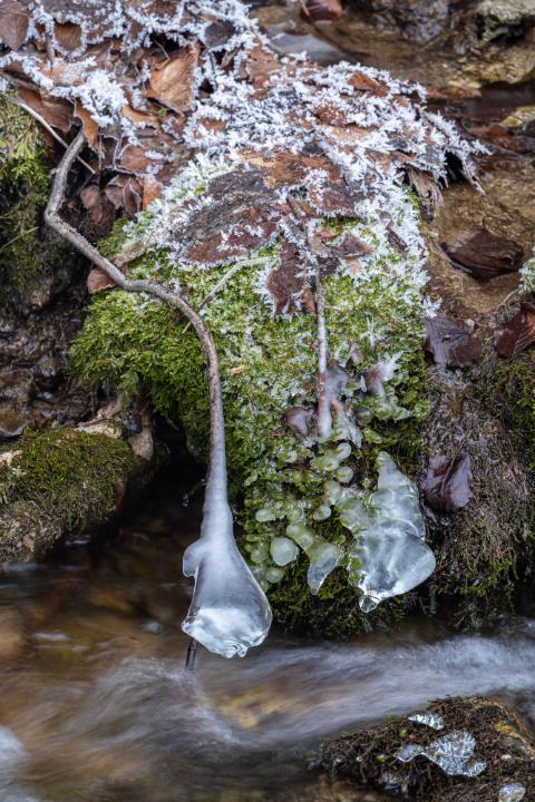 Zweigende mit filigranen und dicken Eisfiguren über dem Steinbach