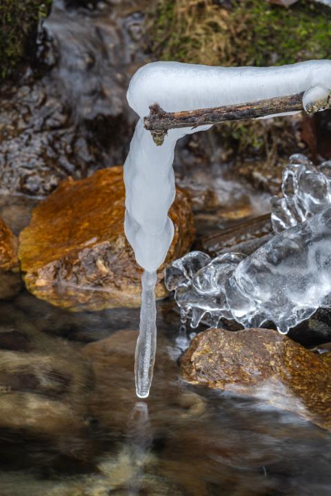 Dicker Eisfinger hängt von vereistem Astende über den Zellgrabenbach