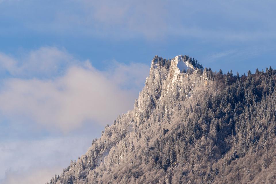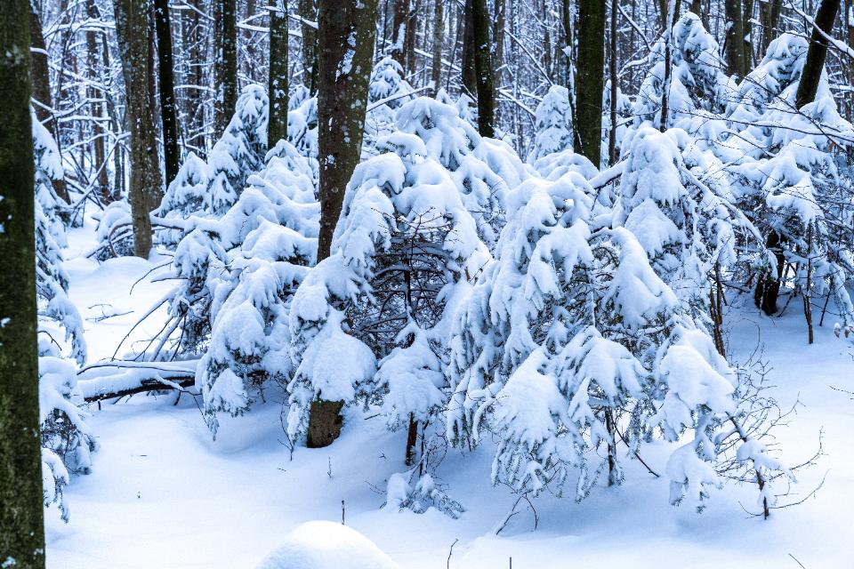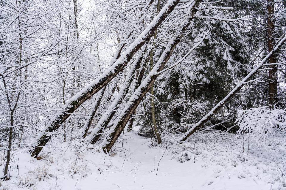 Schneebedeckte, verästelte Bäume am Östlichen Höhenweg bei Aschau