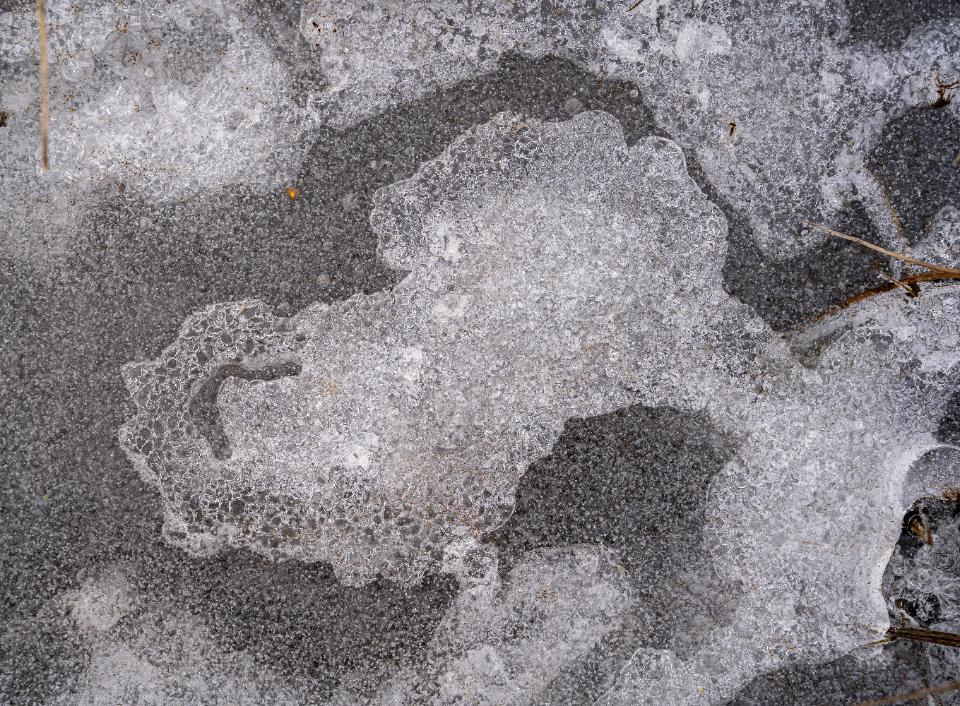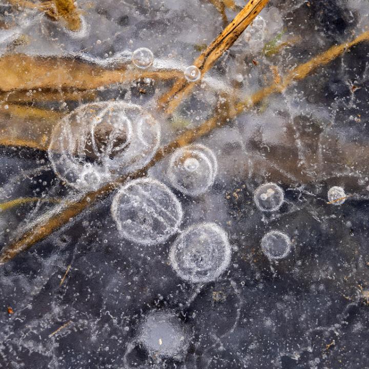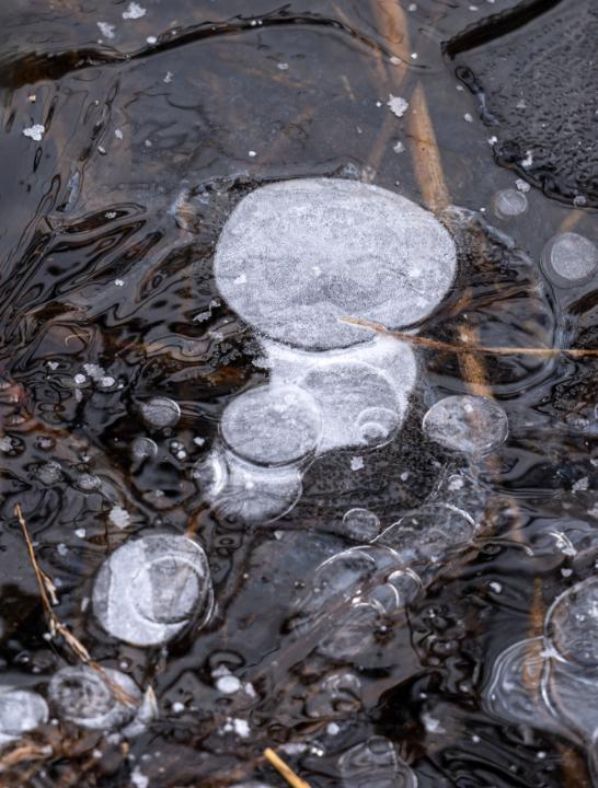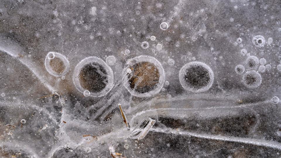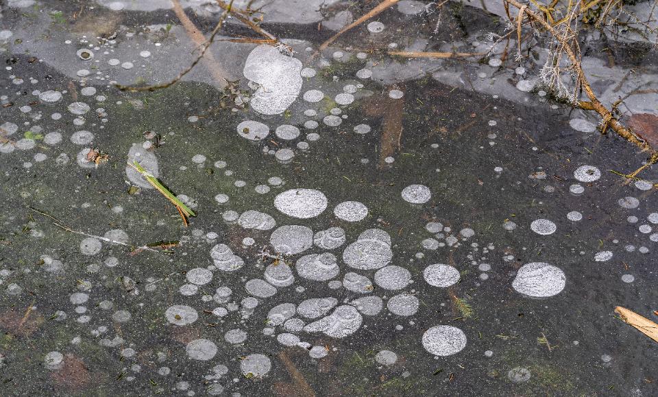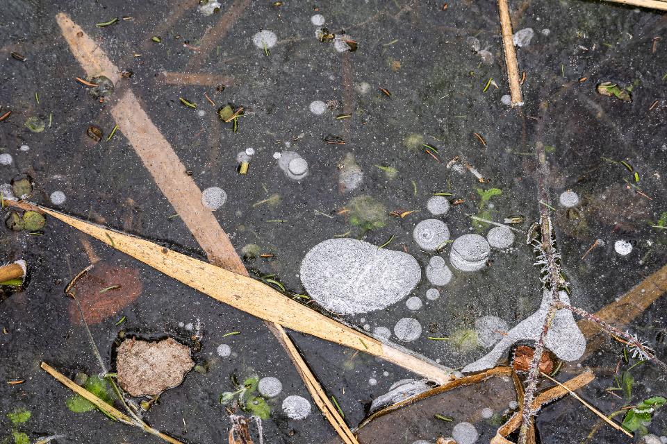 Verschieden große Lufteinschlüsse in Eisdecke am Bärnseebach