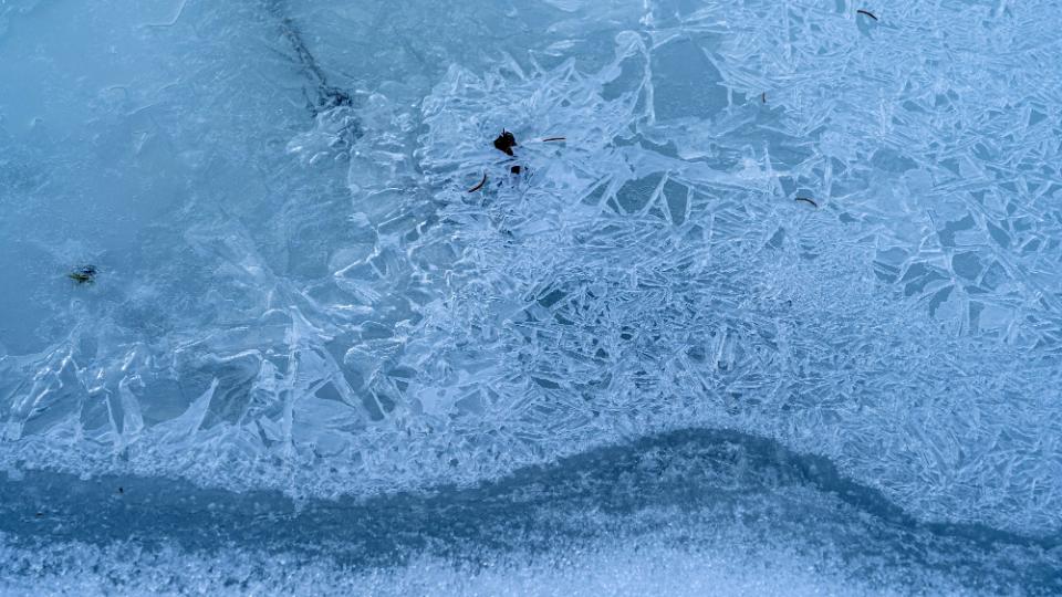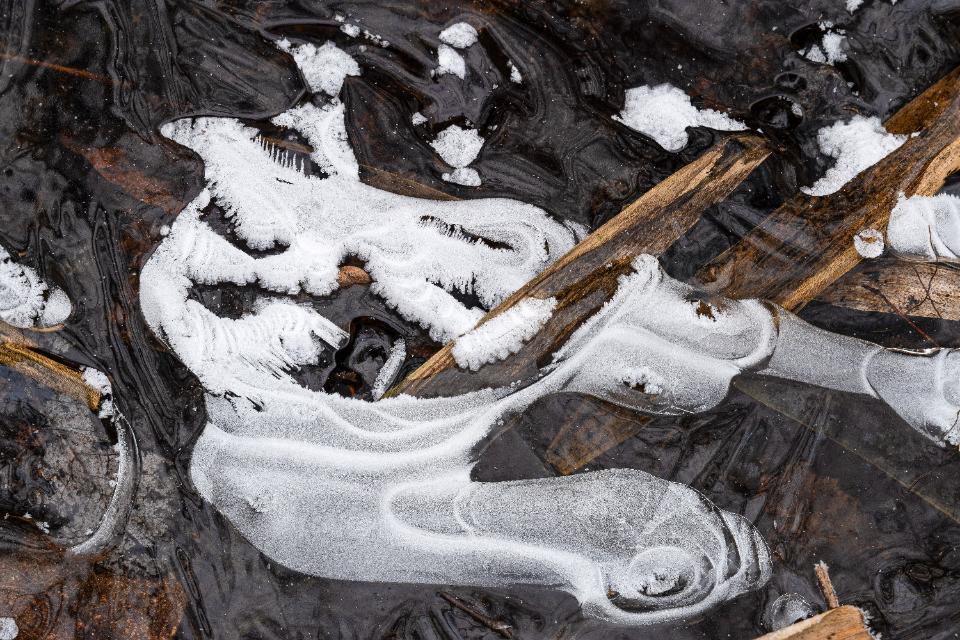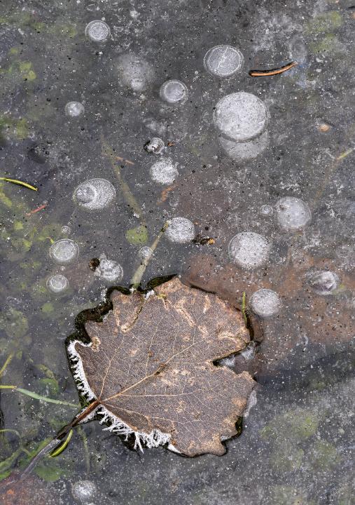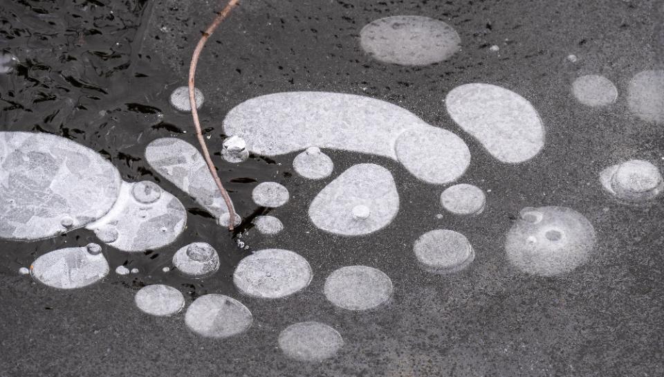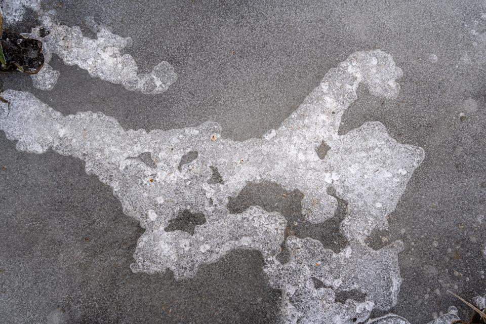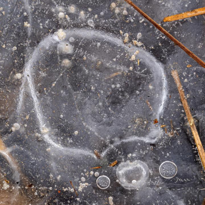 Verschieden große Lufteinschlüsse in Eisdecke am Bärnseebach