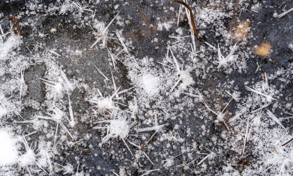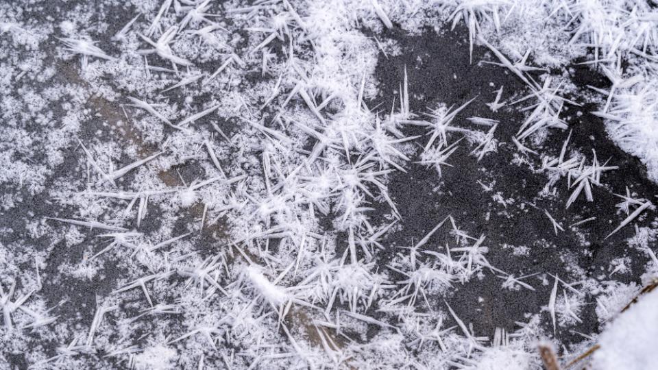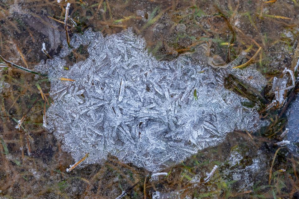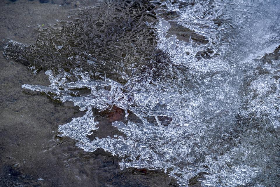 Unzählige Eissterne umgeben dunkle Eisdecke am Bärnseebach