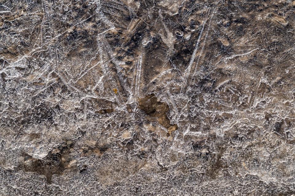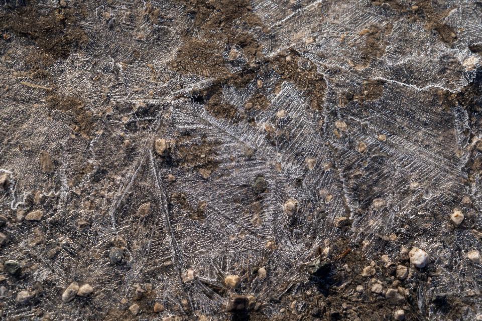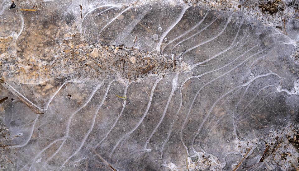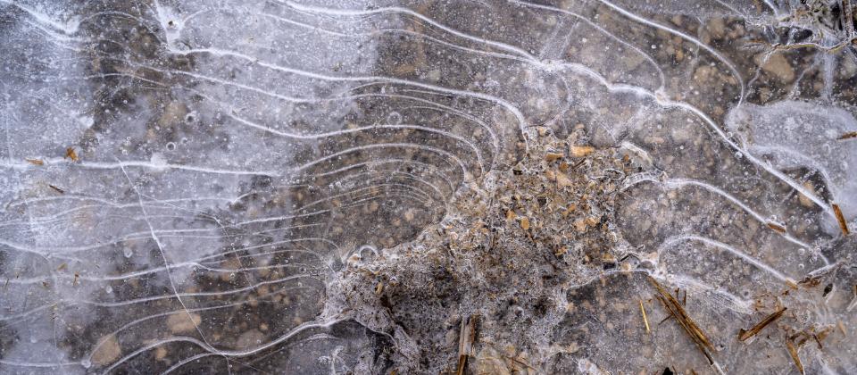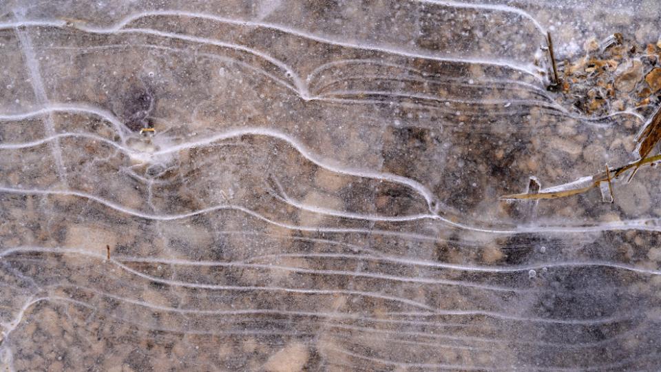 Kiesansammlung in Eisdecke mit geschwungenen hellen Linien