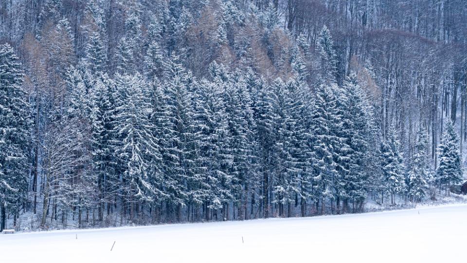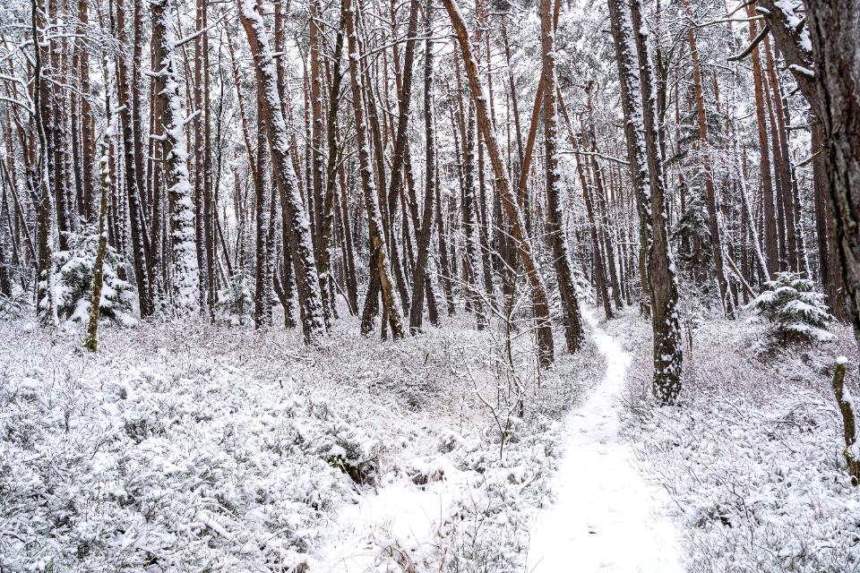 Winterlicher Wanderweg entlang verschneitem Waldrand