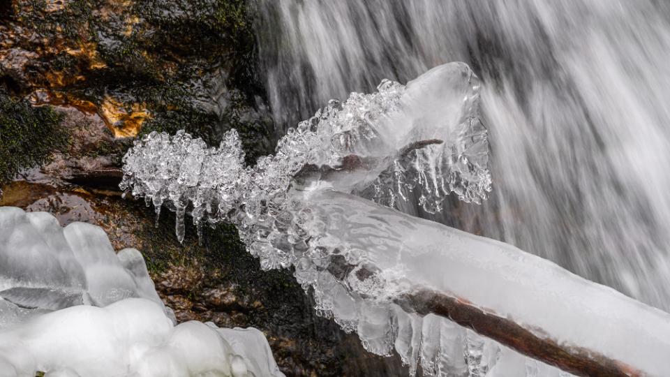 Glitzernde Eisfiguren an Ast bei Kaskade im Steinbach