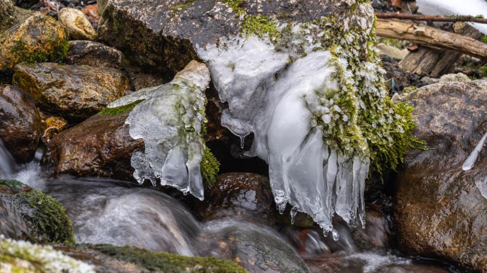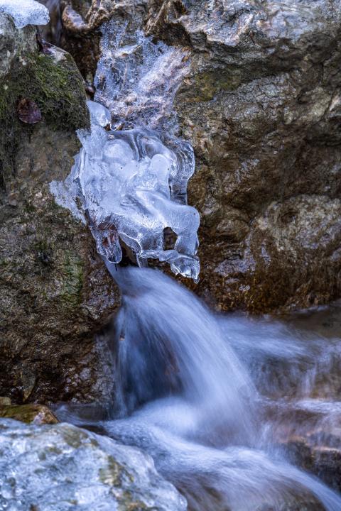 Felsen im Lochgrabenbach mit erstarrten Eisfiguren