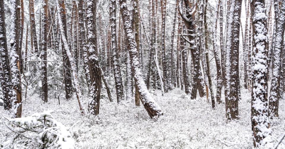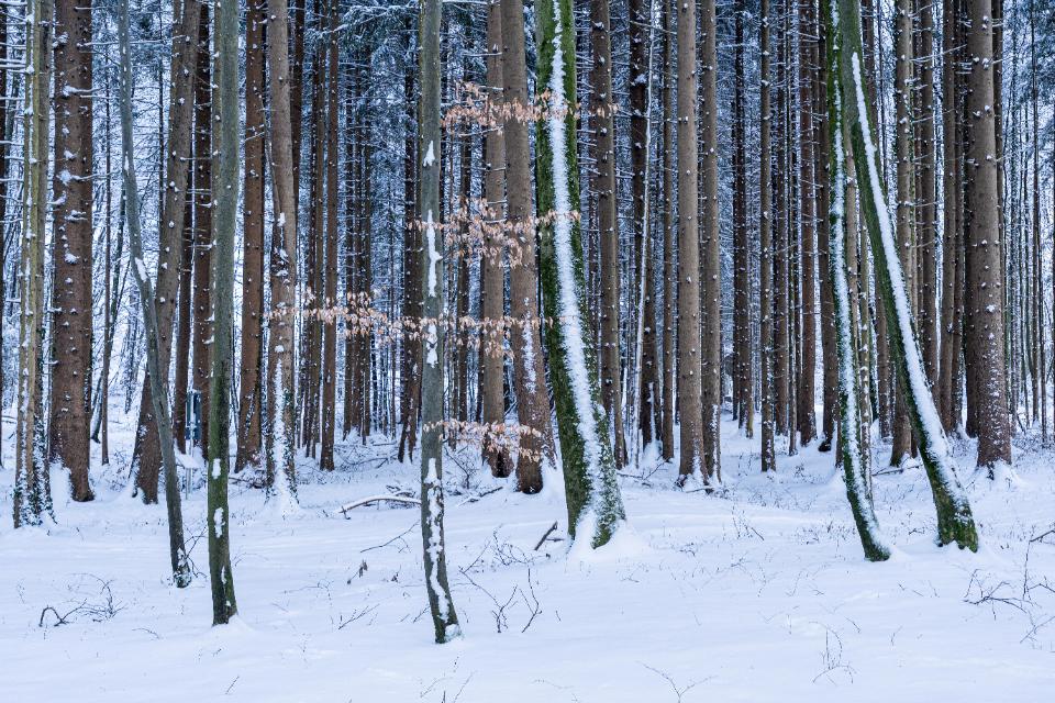 Verschneite Kiefernstämme im Kendlmühlfilzn