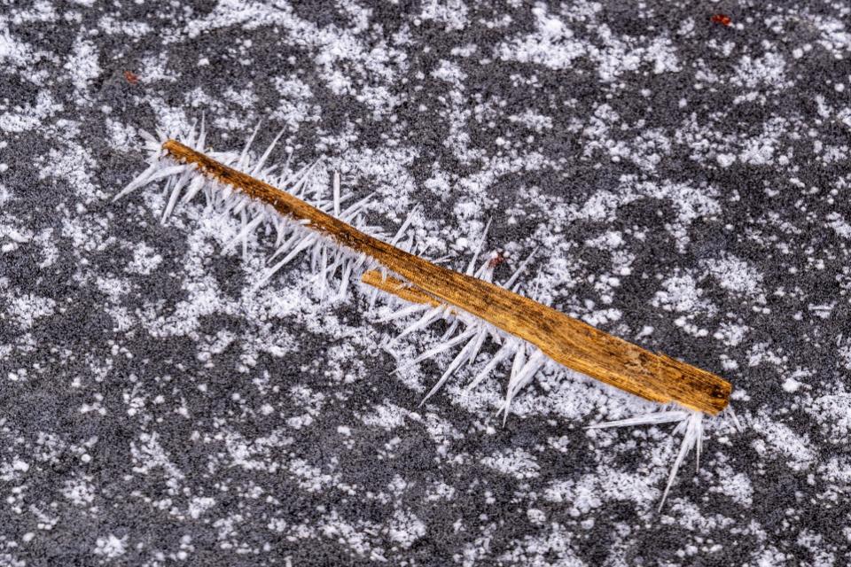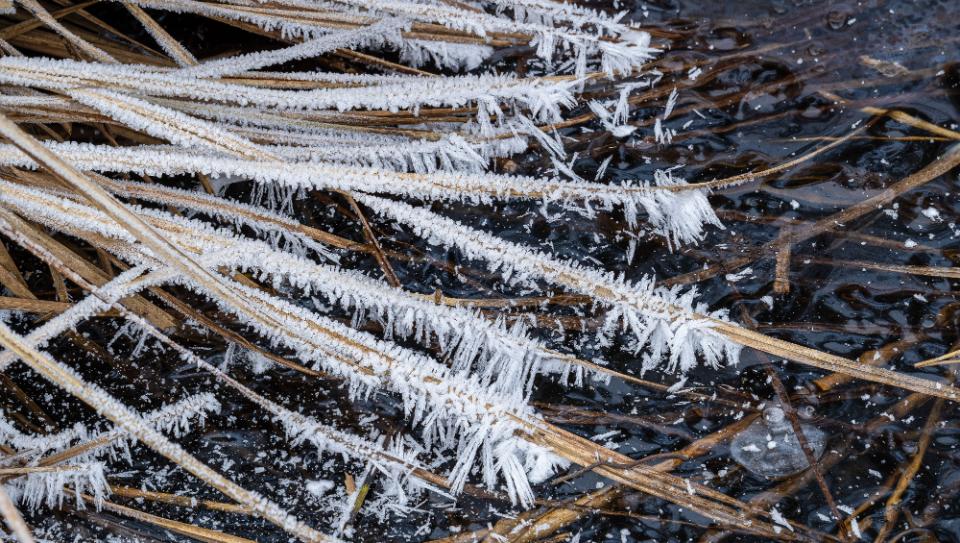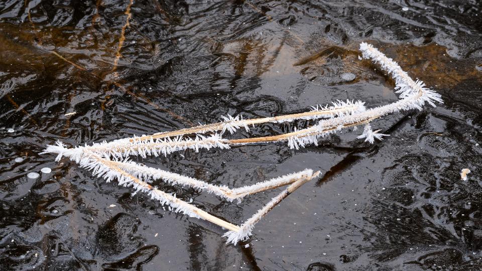 Riesige Eisnadeln an Schilfhalmen auf dünner Eisdecke am Bärnseebach