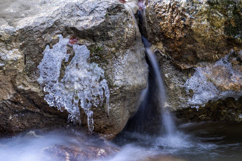 Teledetail der Eiskristalle über dem Lochgrabenbach