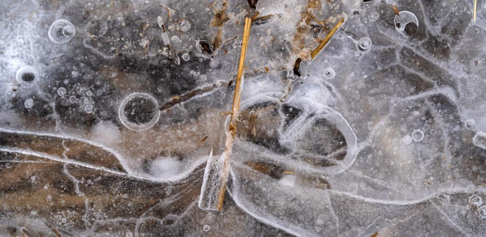 Eisfläche im Schilfgraben mit einer Vielzahl an Lufteinschlüssen