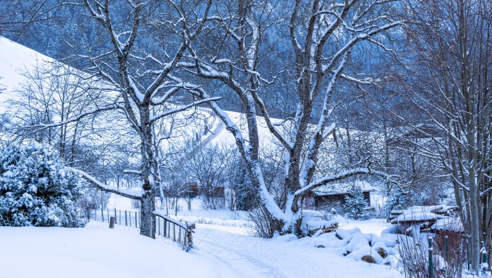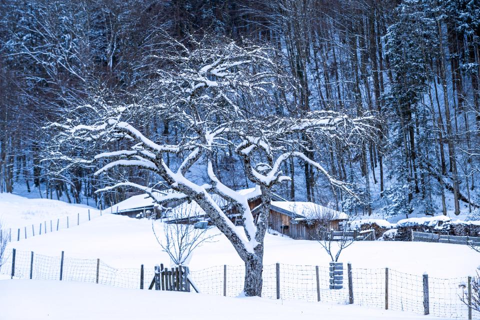Schneebedeckter Obstbaum auf Wiese am Östlichen Höhenweg Aschau