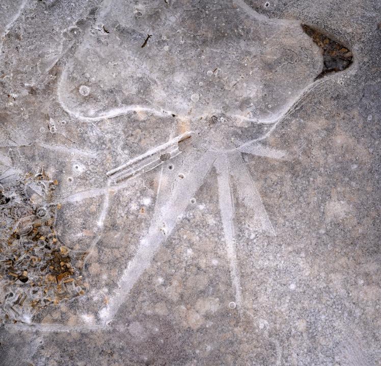 Von Kiesansammlung in Eisdecke gehen geschwungene helle Linien aus