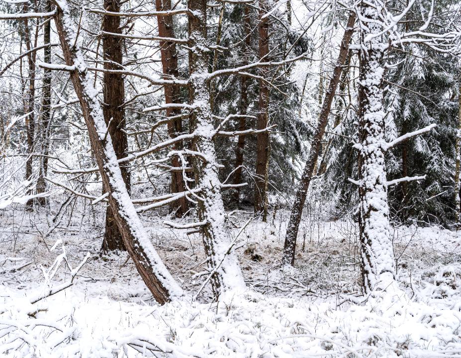 Eingeschneite kleine Fichtenbäume umgeben von dunklen Stämmen