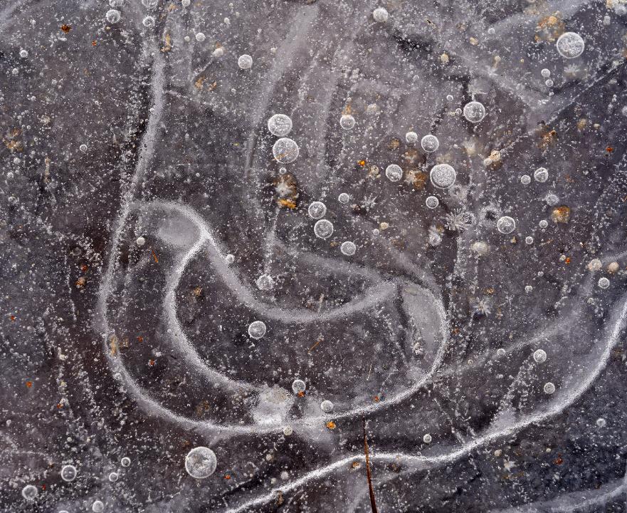 Ausschnitt aus Eisfläche mit unzähligen runden Lufteinschlüssen