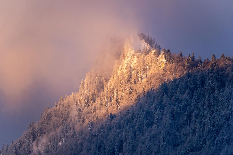 1 Goldenes Morgenlicht auf dem verschneiten Zellerhorn mit Nebel |