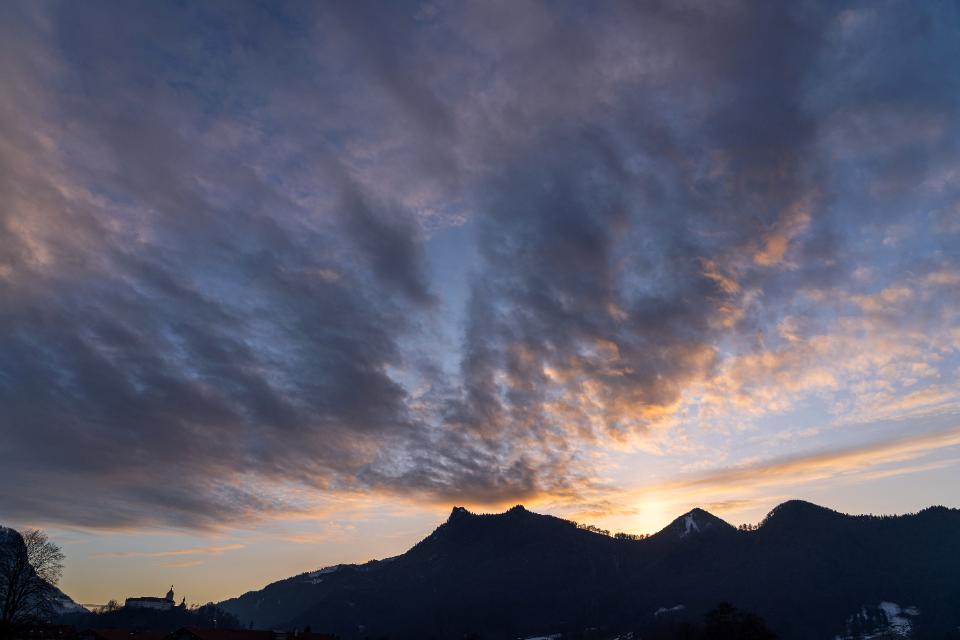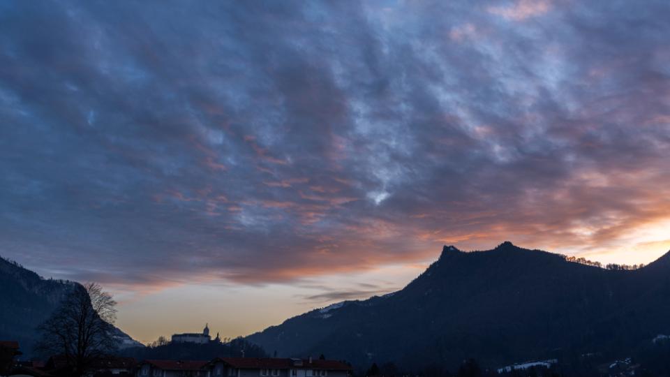 6 Orange leuchtendes Wolkenband am Abendhimmel über Schloß Hohenaschau |