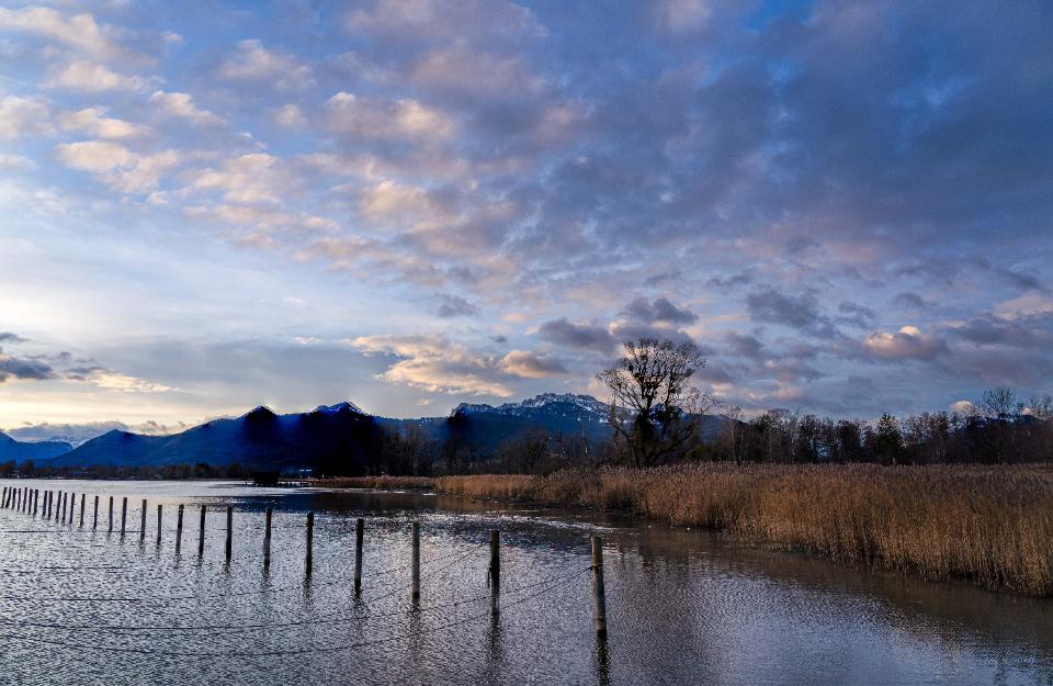 7 Morgenstimmung am Chiemsee mit dunklen Wolken und farbigen Wolkenfetzen |