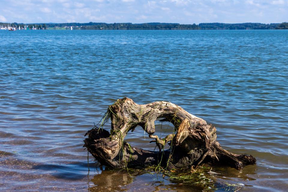 Angeschwemmte Baumwurzel am überfluteten Ufer
