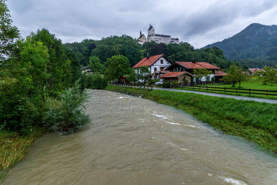 Reißende Prien gegen Schloß Hohenaschau von Kurparkbrücke gesehen