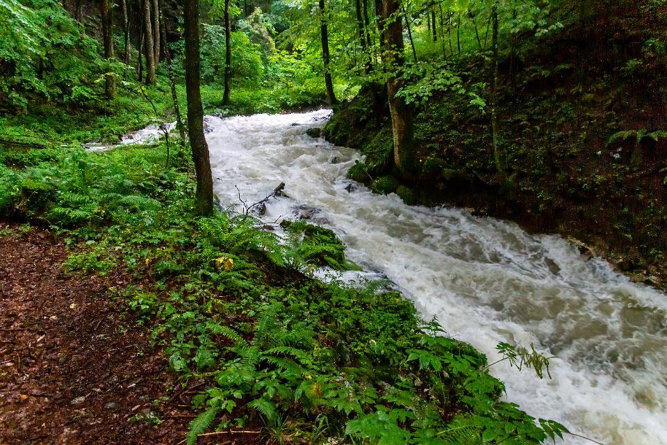 Tiefhängende Äste über rauschenden Prien bei der Klause