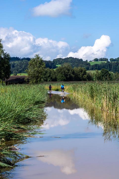 Radfahrer durchqueren den gefluteten Weg nahe Felden