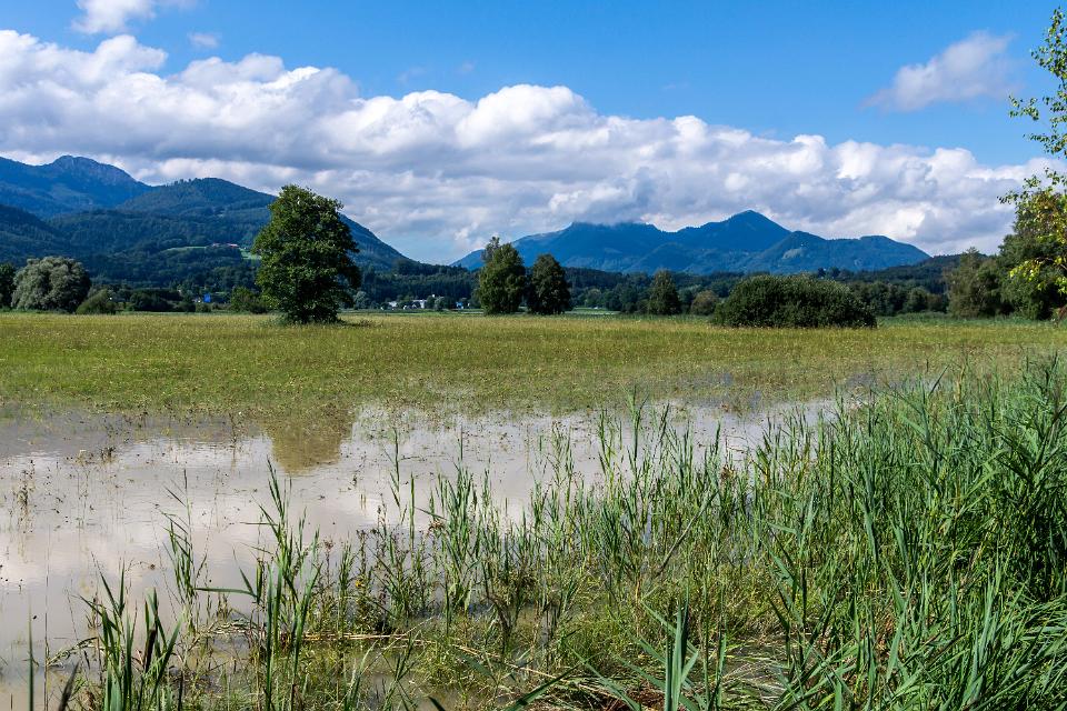 Überschwemmte Felder nahe dem Chiemsee mit Bergblick