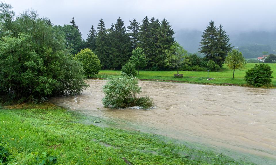 Überschwemmter Uferbereich mit Büschen im Hochwasser
