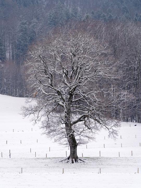 Einzelne Eiche mit Neuschnee im Teleblick