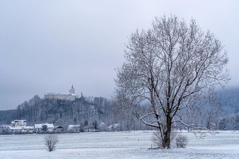 Frische Schneeauflage auf Baum mit Schloß Hohenaschau