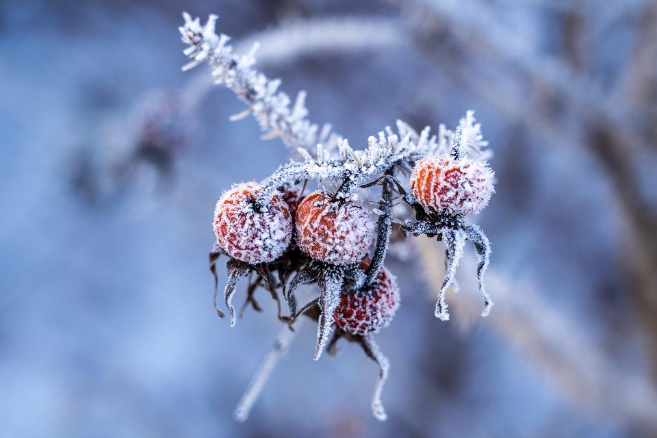 Hagebutten Gruppe von Raureif bedeckt