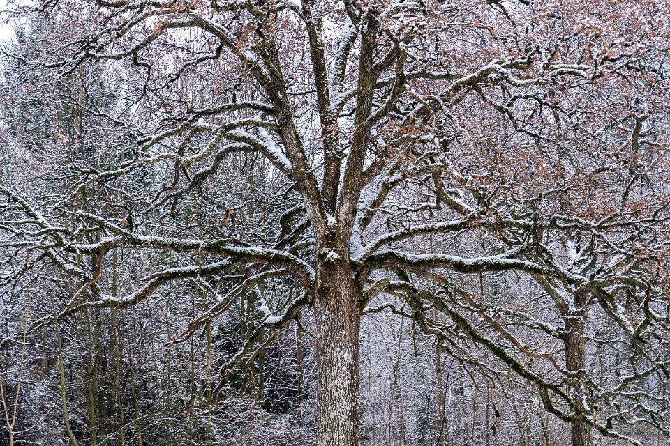 Krakenartig ausladende Äste an winterlicher Eiche