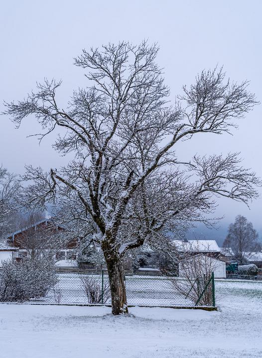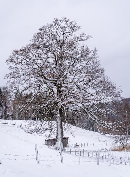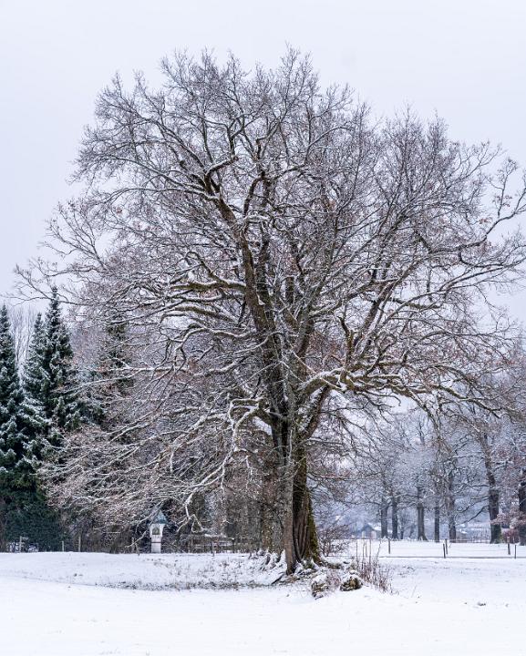 Mächtige Eiche am Moorbadweg frisch verschneit