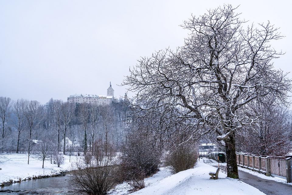 Neuschnee auf Baum am Prienufer mit Schloß Hohenaschau