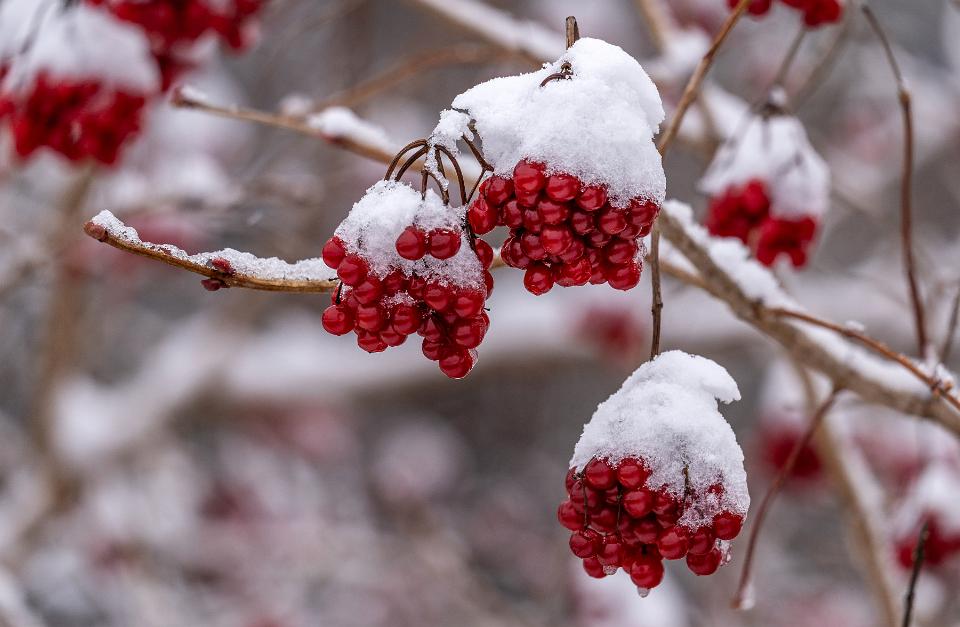 Neuschnee auf Beerenrispen des Gemeinen Schneeballs