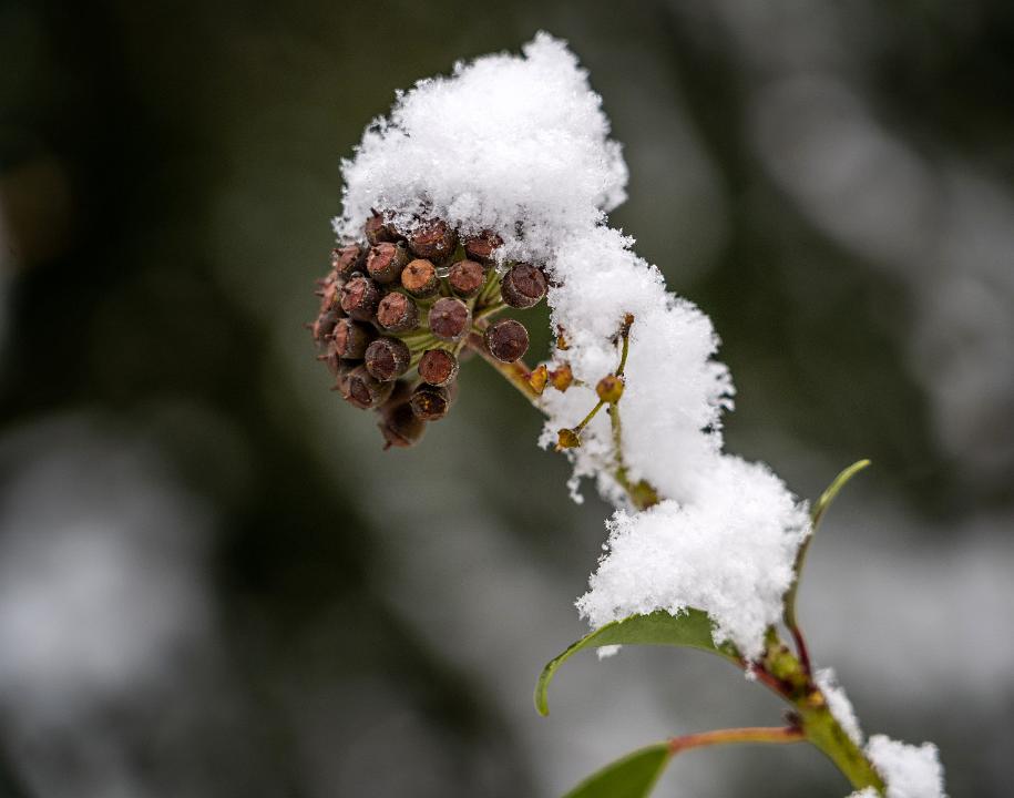 Neuschnee auf getrocknetem Efeu Blütenstand