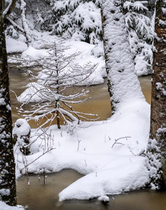 Neuschnee auf kleinem Bäumchen und Baumstamm in gefrorenem Moortümpel