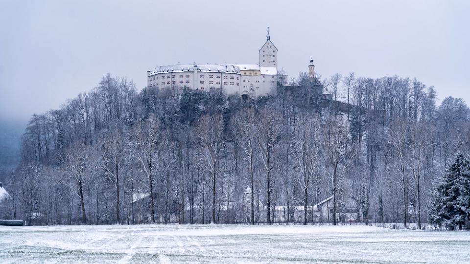 Schloß Hohenaschau über winterlicher Pappelreihe