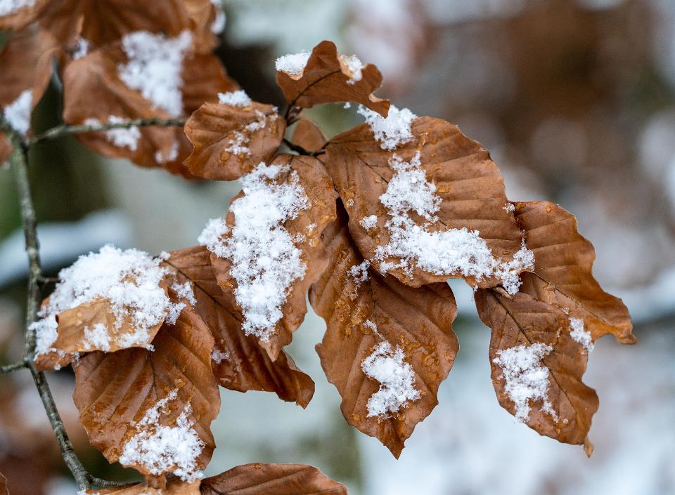 Schmelzender Neuschnee auf getrockneten Blättern