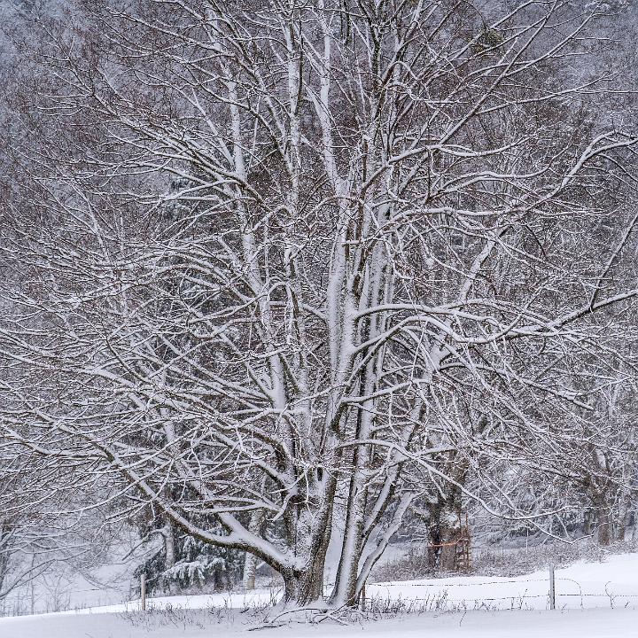 Teleblick zu mächtiger Baumgruppe frisch verschneit