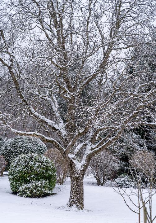 Neuschnee auf einem ausladenden Baum