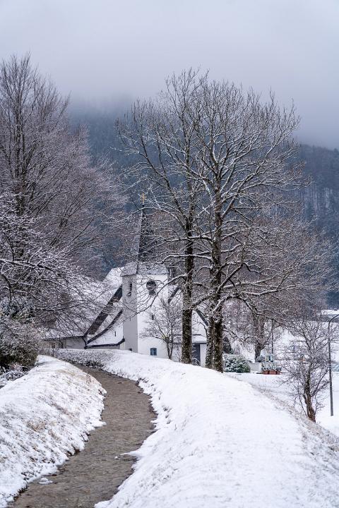 Winterliche Landschaft am Lochgrabenbach mit ev. Kirche in Aschau
