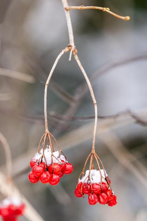 Zwei Beerenrispen des Gemeinen Schneeballs bedeckt von Schnee